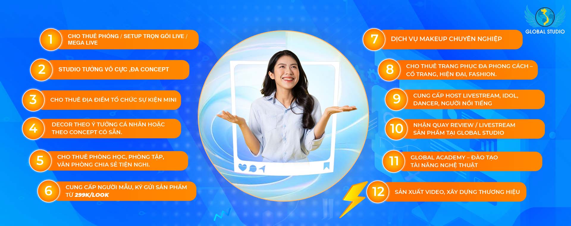 Khi bạn đến với dịch vụ cho thuê phòng livestream Mega Live tại Global Studio nơi mang đến cho bạn không gian lý tưởng để phát sóng trực tiếp với chất lượng hình ảnh và âm thanh tuyệt vời! Trang thiết bị hiện đại, ánh sáng chuyên nghiệp và không gian rộng rãi, chúng tôi cam kết giúp bạn tạo ra những buổi live stream ấn tượng và thu hút người xem.với cơ sở vật chất hiện đại Global Studio đang có sẵn các dịch vụ :
