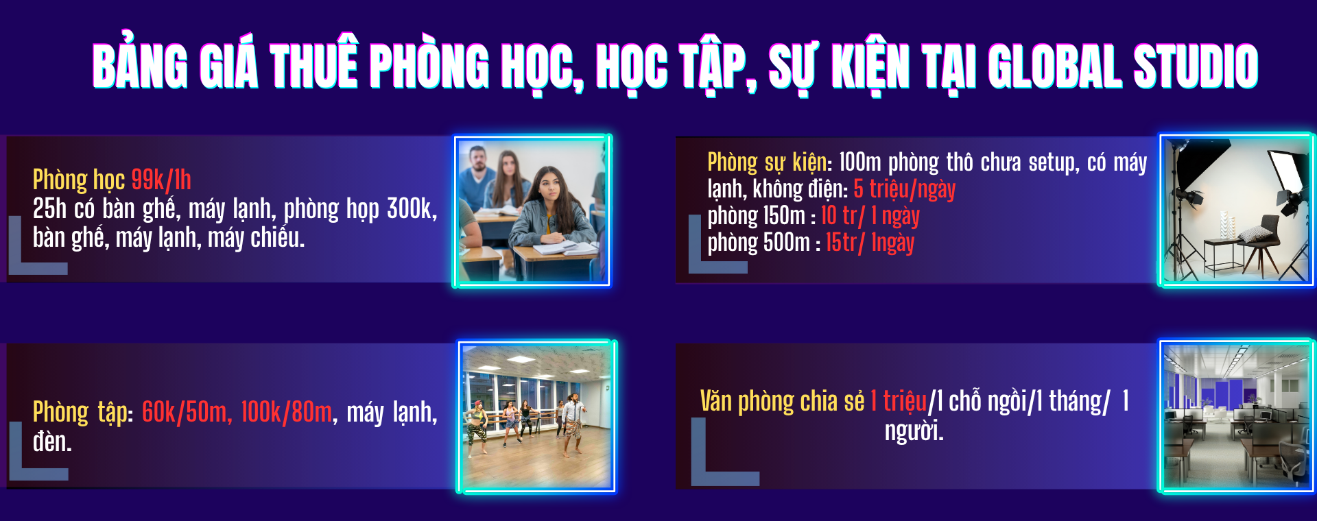Tại Global Studio, chúng tôi hiểu rằng mỗi khách hàng có nhu cầu khác nhau: từ giảng dạy, tổ chức lớp học, đến quay video content, làm workshop mini hay thuê phòng họp cao cấp. Vì vậy, bảng giá được thiết kế linh hoạt – minh bạch – tối ưu chi phí, phù hợp cho cá nhân, nhóm sáng tạo, doanh nghiệp vừa & nhỏ.